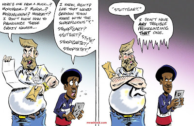 Rasheed, Muhammad. "Triumphantly Out of Your League." Cartoon. The Official Website of Cartoonist M. Rasheed 01 Apr 2021. Pen & ink w/Adobe Photoshop color.