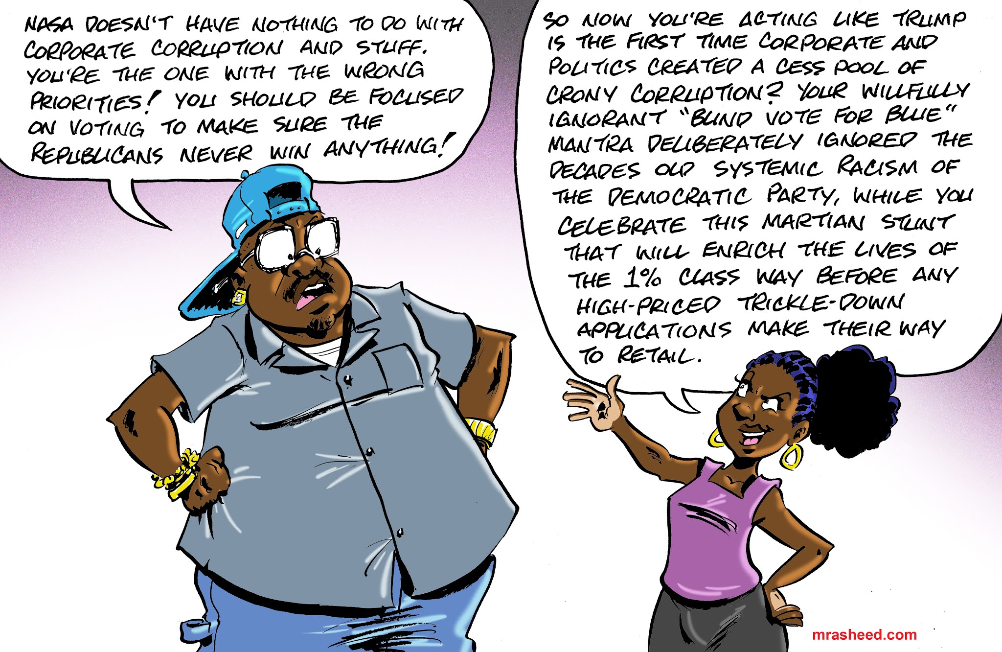 Rasheed, Muhammad. "Final Answer: The End of Exploitation." Cartoon. The Official Website of Cartoonist M. Rasheed 21 Feb 2021. Pen & ink w/Adobe Photoshop color.