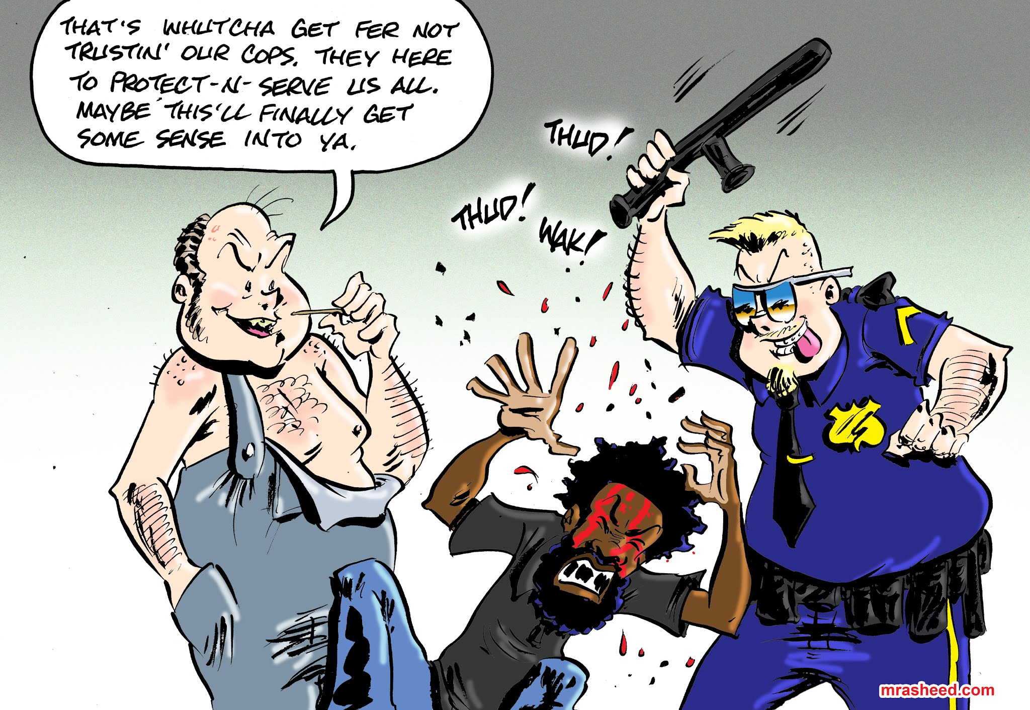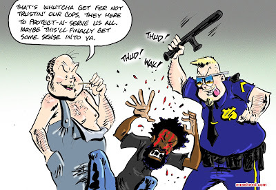 Rasheed, Muhammad. "Brutality with a Thin Coating of Blue." Cartoon. The Official Website of Cartoonist M. Rasheed 23 Feb 2021. Pen & ink w/Adobe Photoshop color.