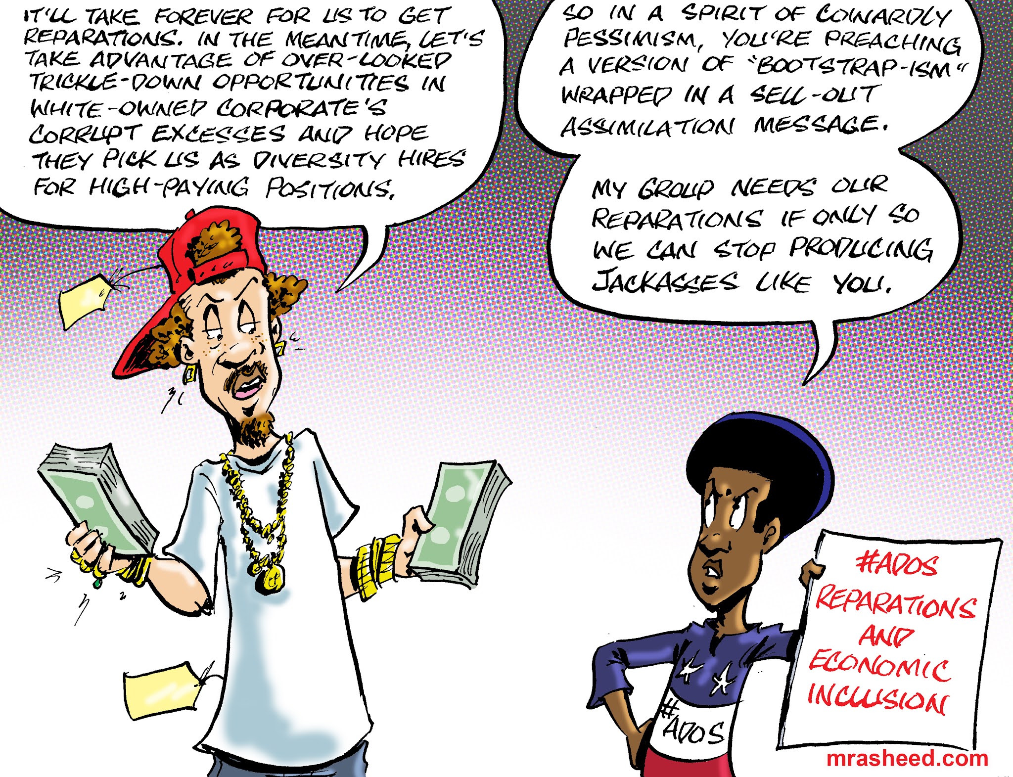 Rasheed, Muhammad. "When 'Love of Money' Overrides the Freedom Goal of Economic Inclusion." Cartoon. The Official Website of Cartoonist M. Rasheed 23 Feb 2021. Pen & ink w/Adobe Photoshop color.