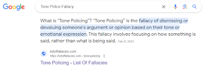 To be clear, “tone policing” is indeed an official logical fallacy, and described as such within every definition from any source you’d care to use, since you hate blogs published by the “idiot” at the top of my casual Internet search for the term.