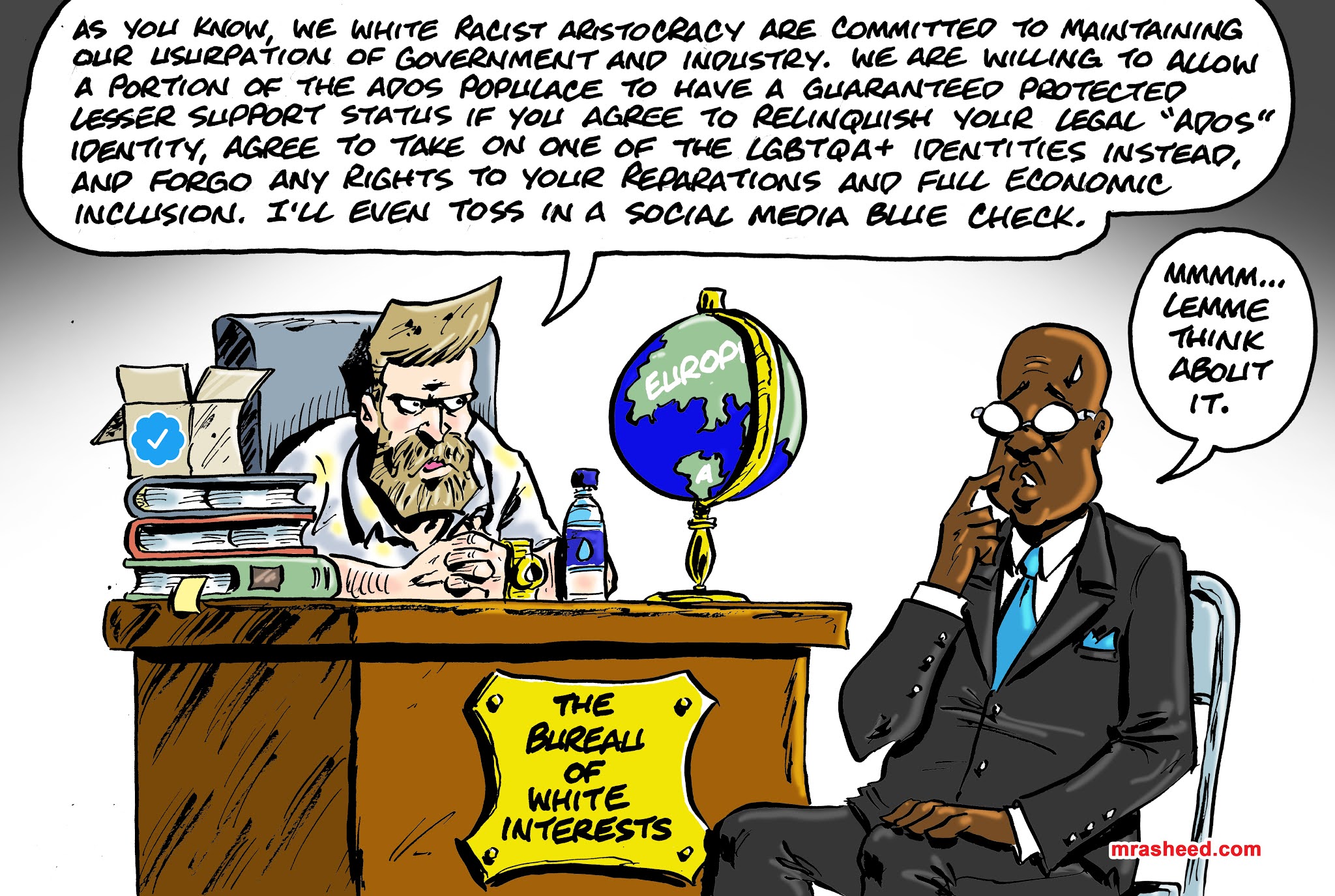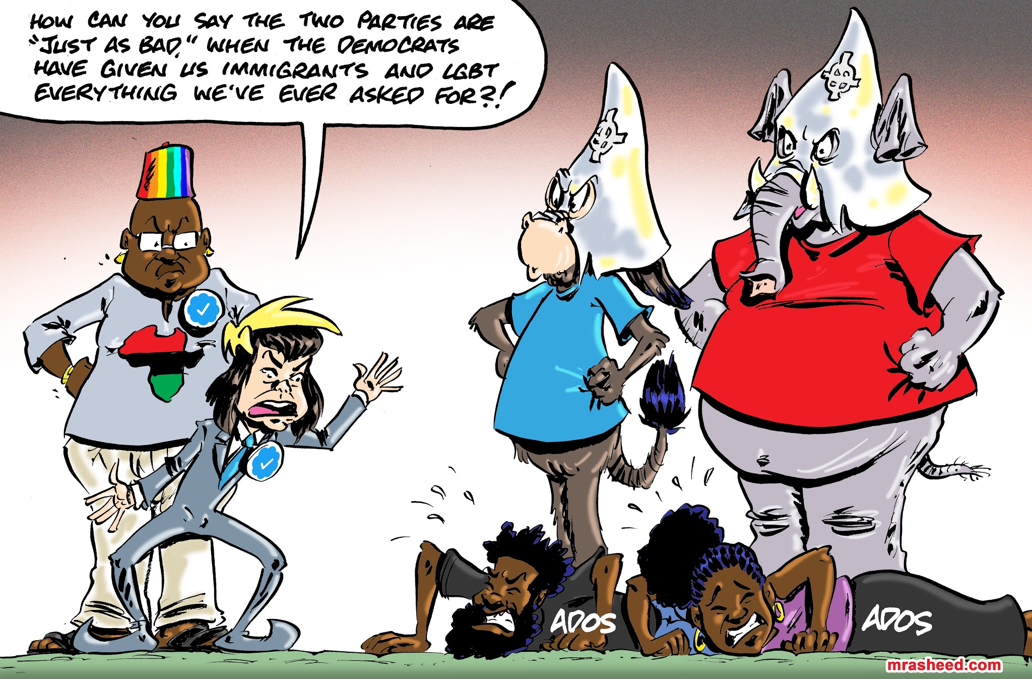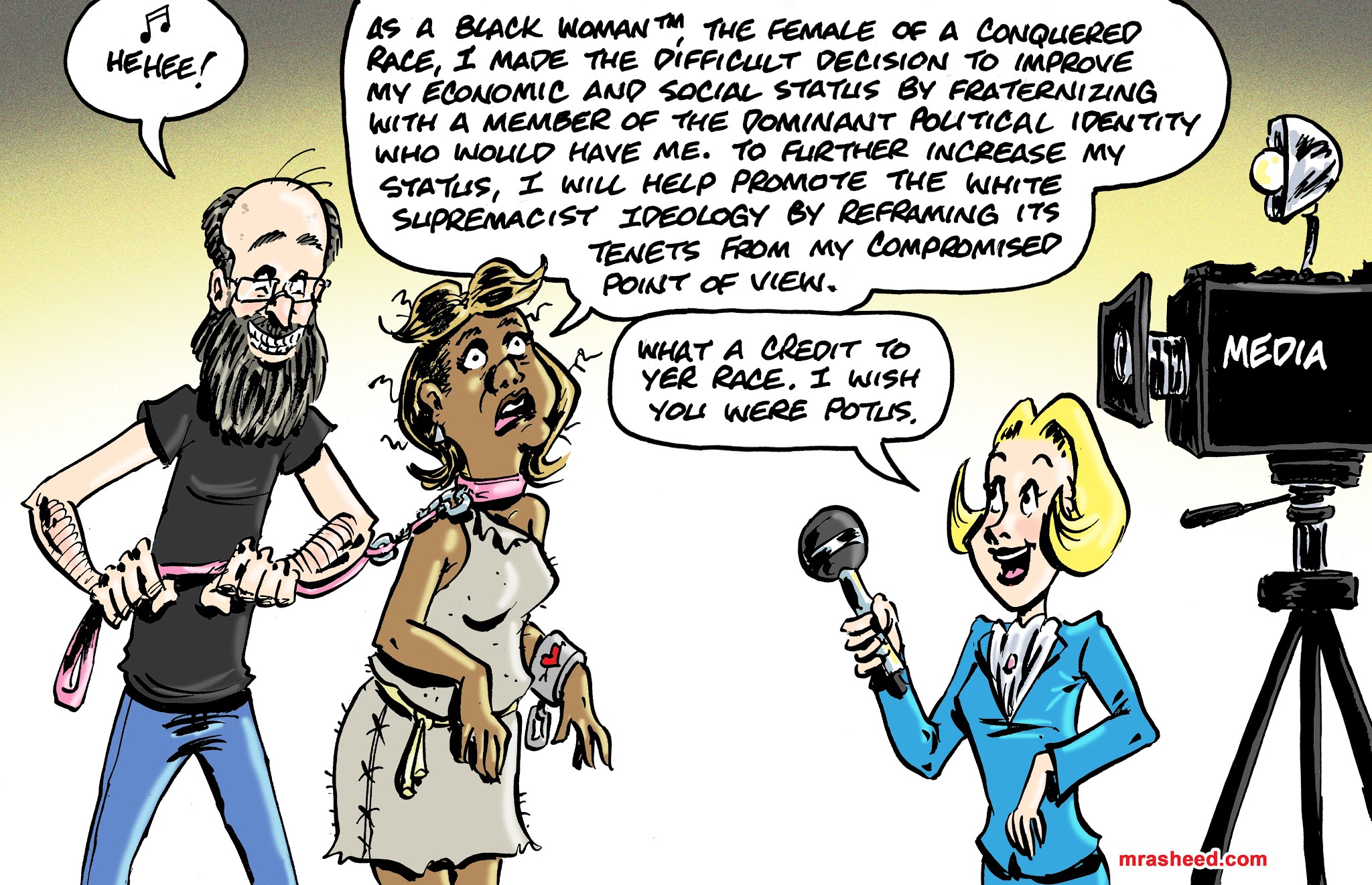 Rasheed, Muhammad. "In Blind Defense of Their Light-Skinned 'POC' Crush." Cartoon. The Official Website of Cartoonist M. Rasheed 12 Dec 2020. Pen & ink w/Adobe Photoshop color.
