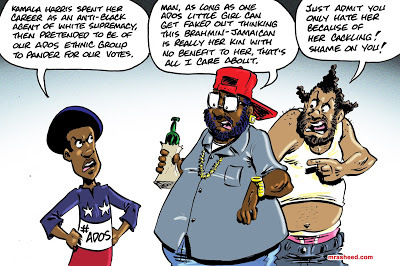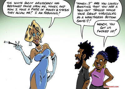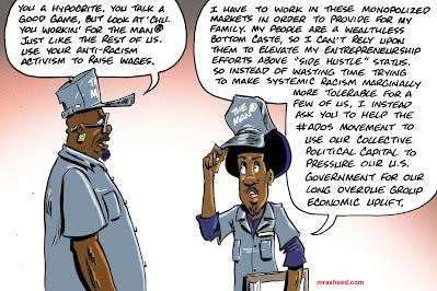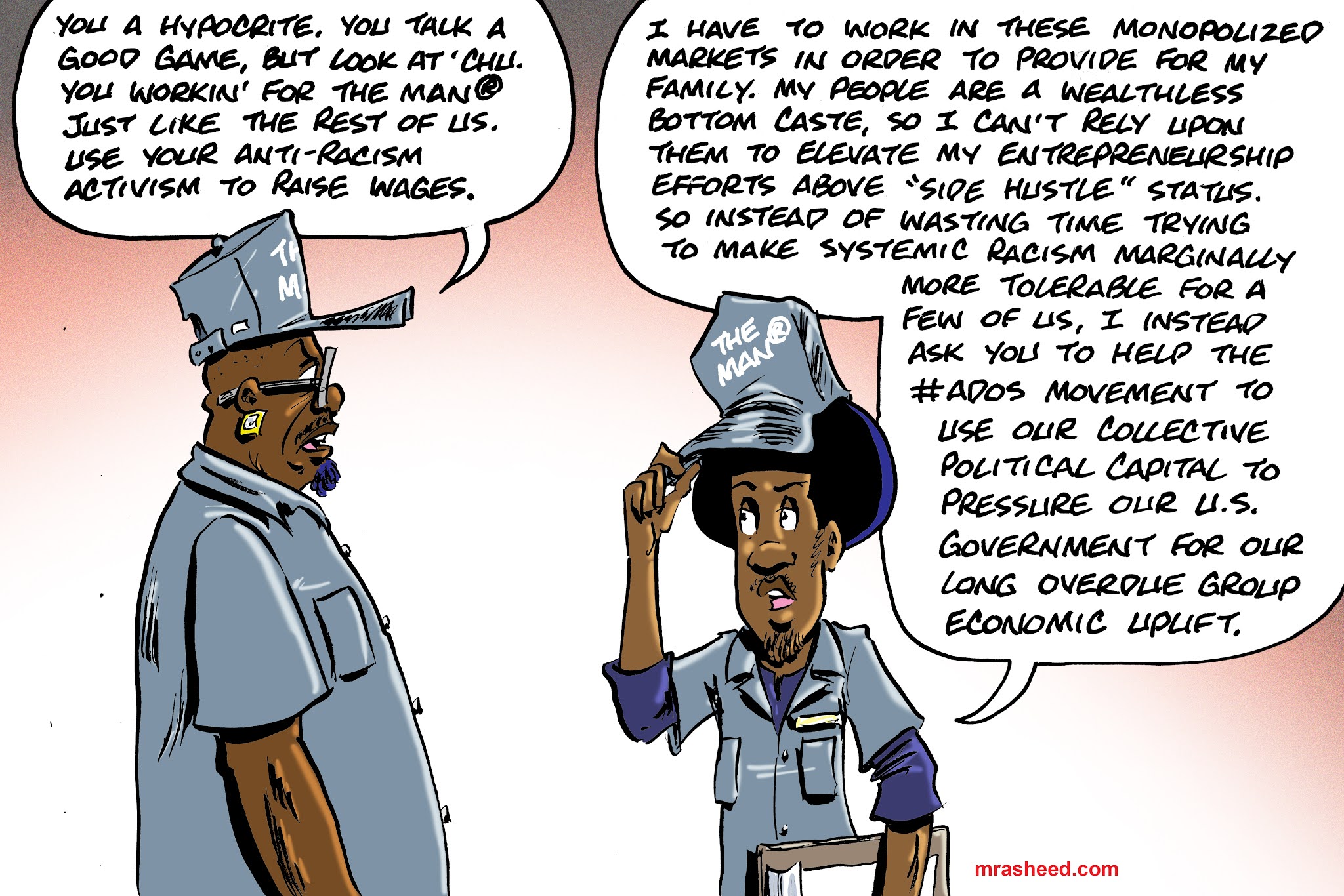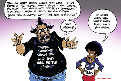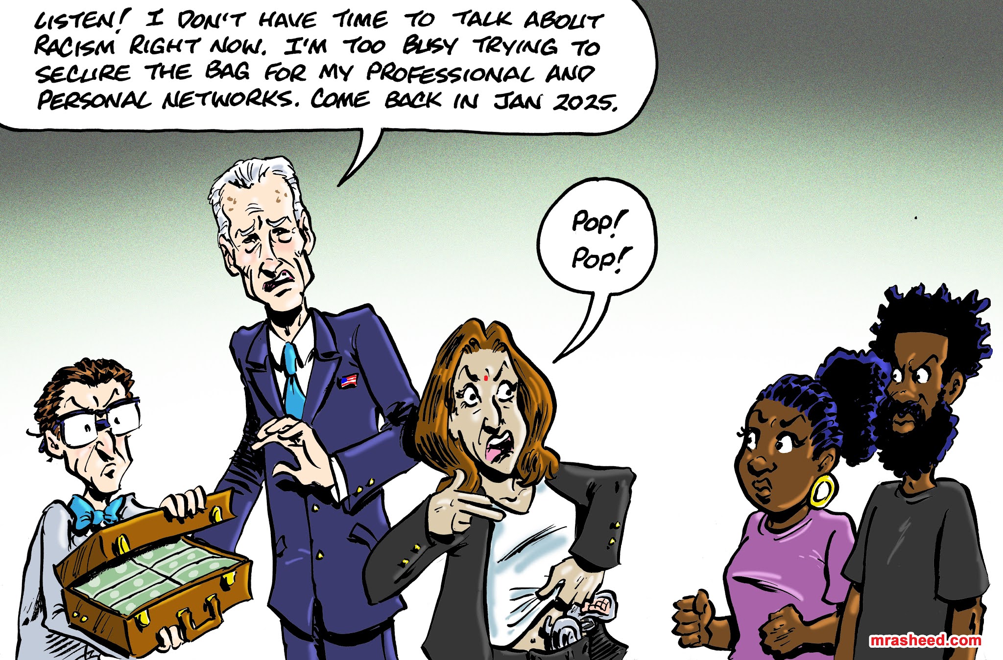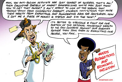 Rasheed, Muhammad. "In Blind Defense of Their Light-Skinned 'POC' Crush." Cartoon. The Official Website of Cartoonist M. Rasheed 12 Dec 2020. Pen & ink w/Adobe Photoshop color.