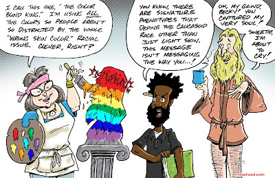 Rasheed, Muhammad. "Why is Modern 'Progress' Indistinguishable From Regular Ole Self-Serving White Supremacy?" Cartoon. The Official Website of Cartoonist M. Rasheed 28 Apr 2023. Permanent marker w/Adobe Photoshop color.