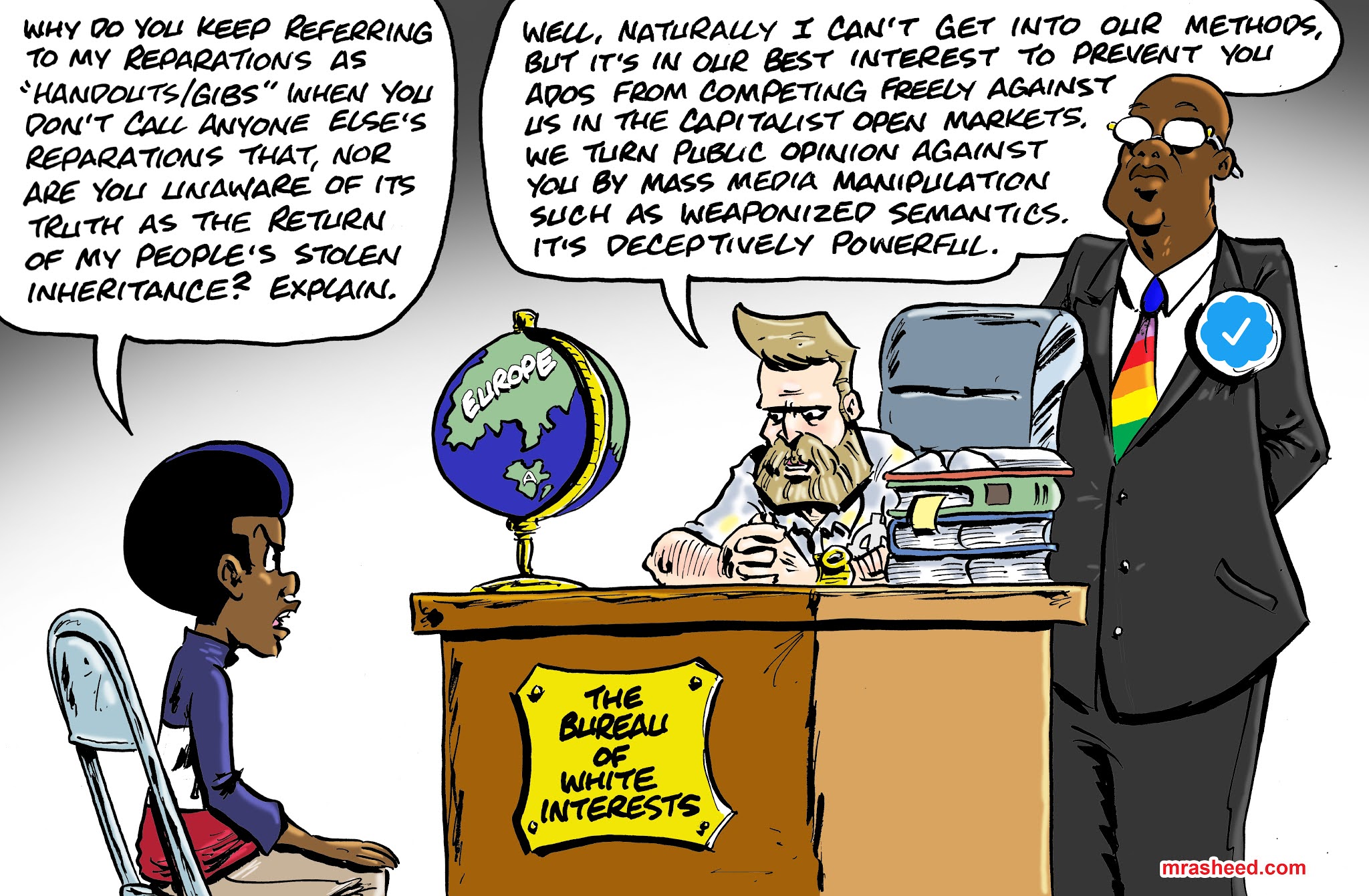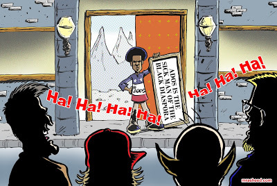 Rasheed, Muhammad. "Pandering for White Gaze Favor." Cartoon. The Official Website of Cartoonist M. Rasheed 21 Nov 2020. Pen & ink w/Adobe Photoshop color.