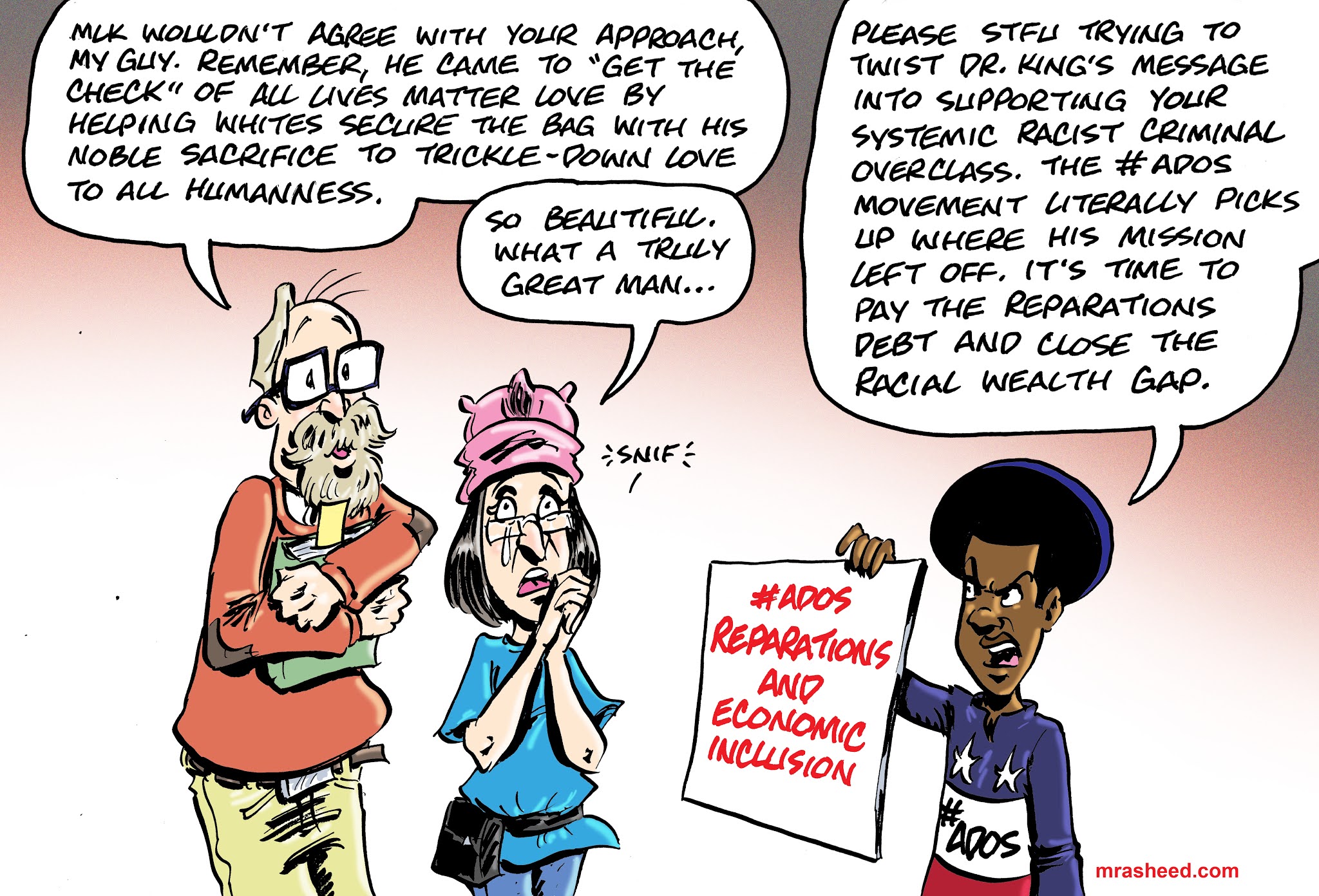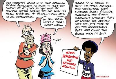 Rasheed, Muhammad. "Filtered Through Whiteness: The Unrecognizable Message of Dr. King." Cartoon. The Official Website of Cartoonist M. Rasheed 22 Nov 2020. Pen & ink w/Adobe Photoshop color.