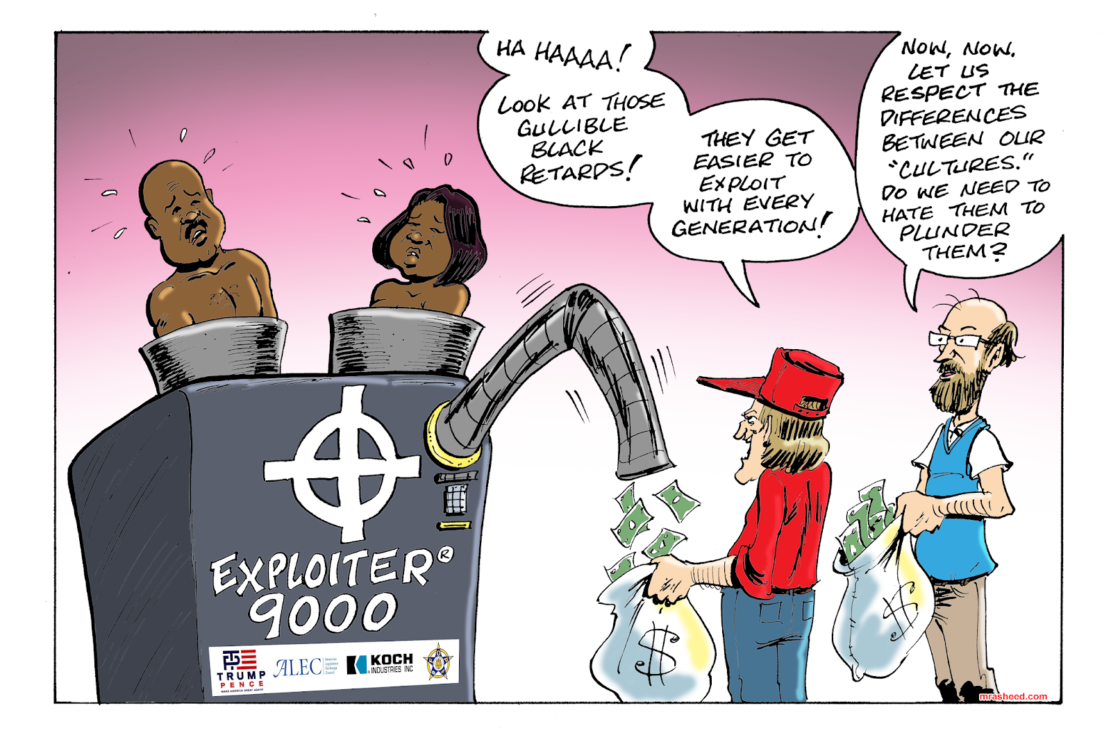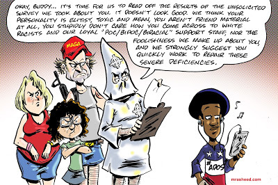Rasheed, Muhammad. "A Knee-Jerk Fake Woke Defense of the Machine." Cartoon. The Official Website of Cartoonist M. Rasheed 03 Nov 2020. Pen & ink w/Adobe Photoshop color.