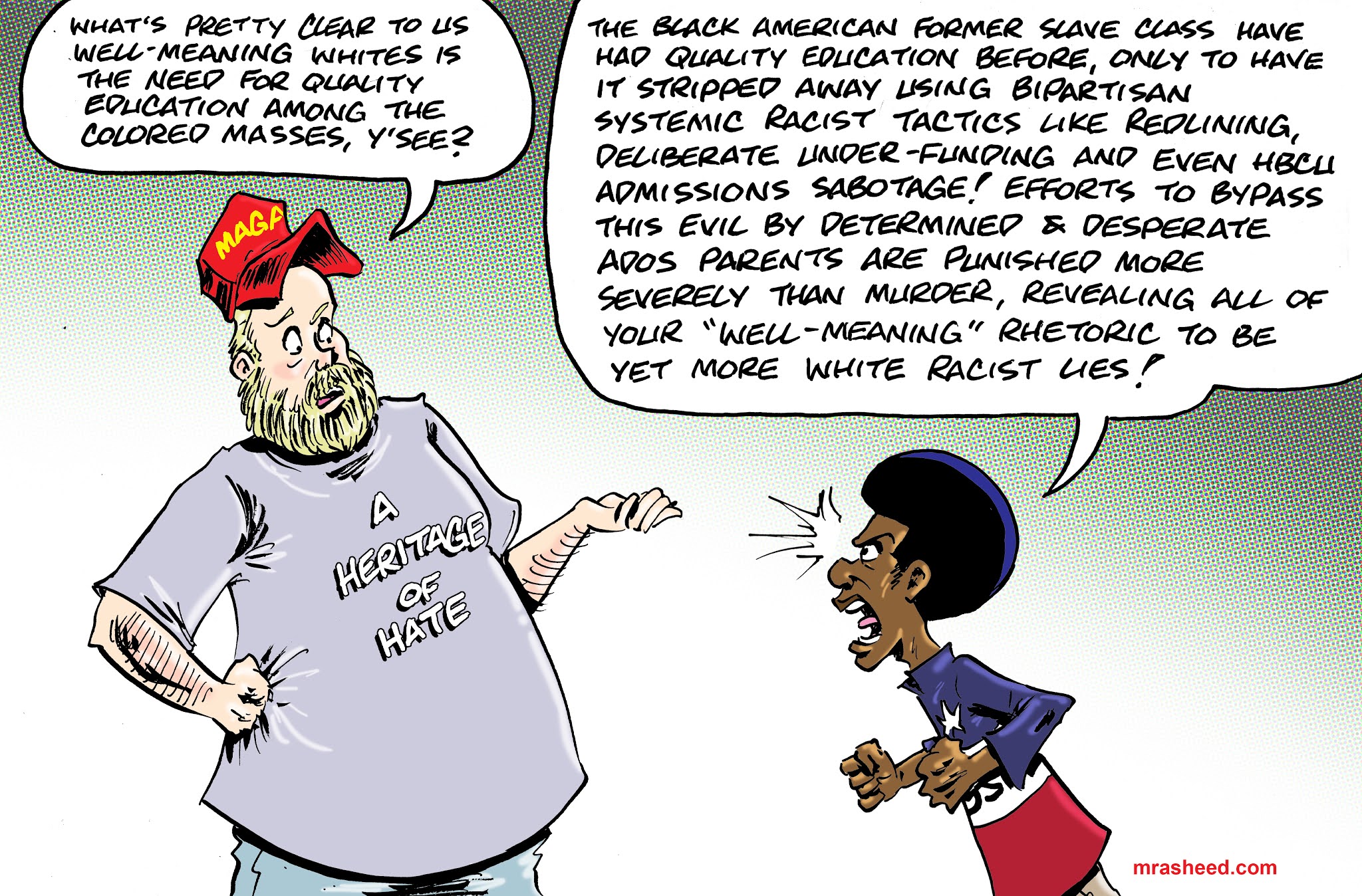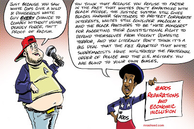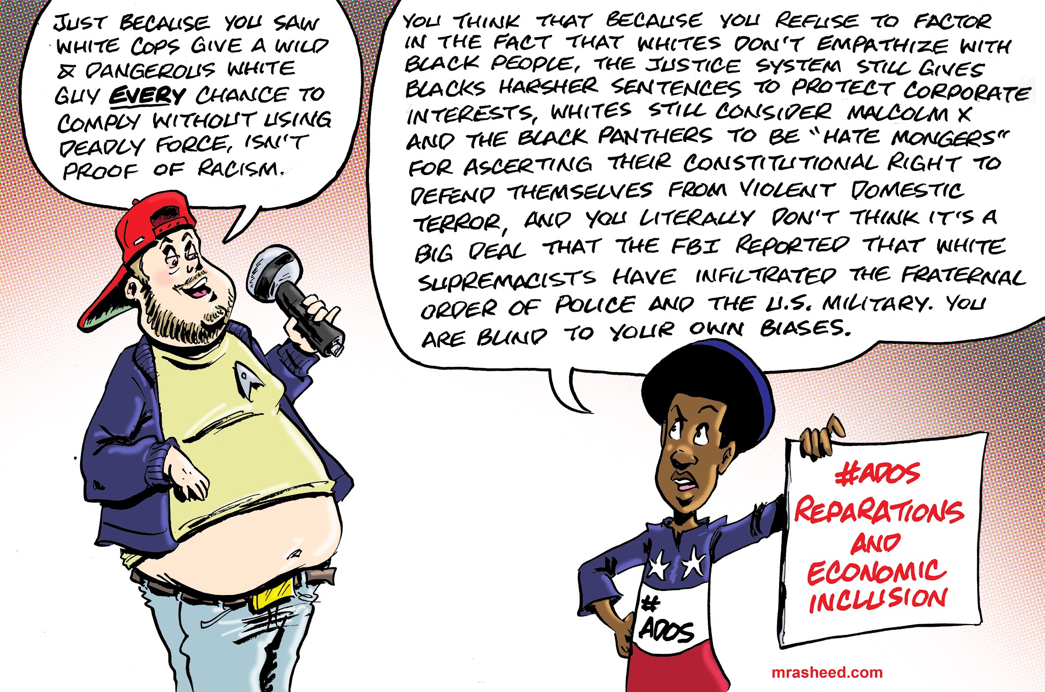 Rasheed, Muhammad. "The Unreasonable Rose-Tint of a 'Post-Racial' Viewpoint." Cartoon. The Official Website of Cartoonist M. Rasheed 28 Sep 2020. Pen & ink w/Adobe Photoshop color.