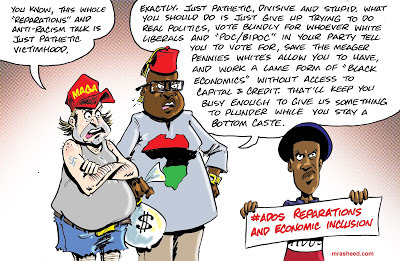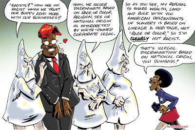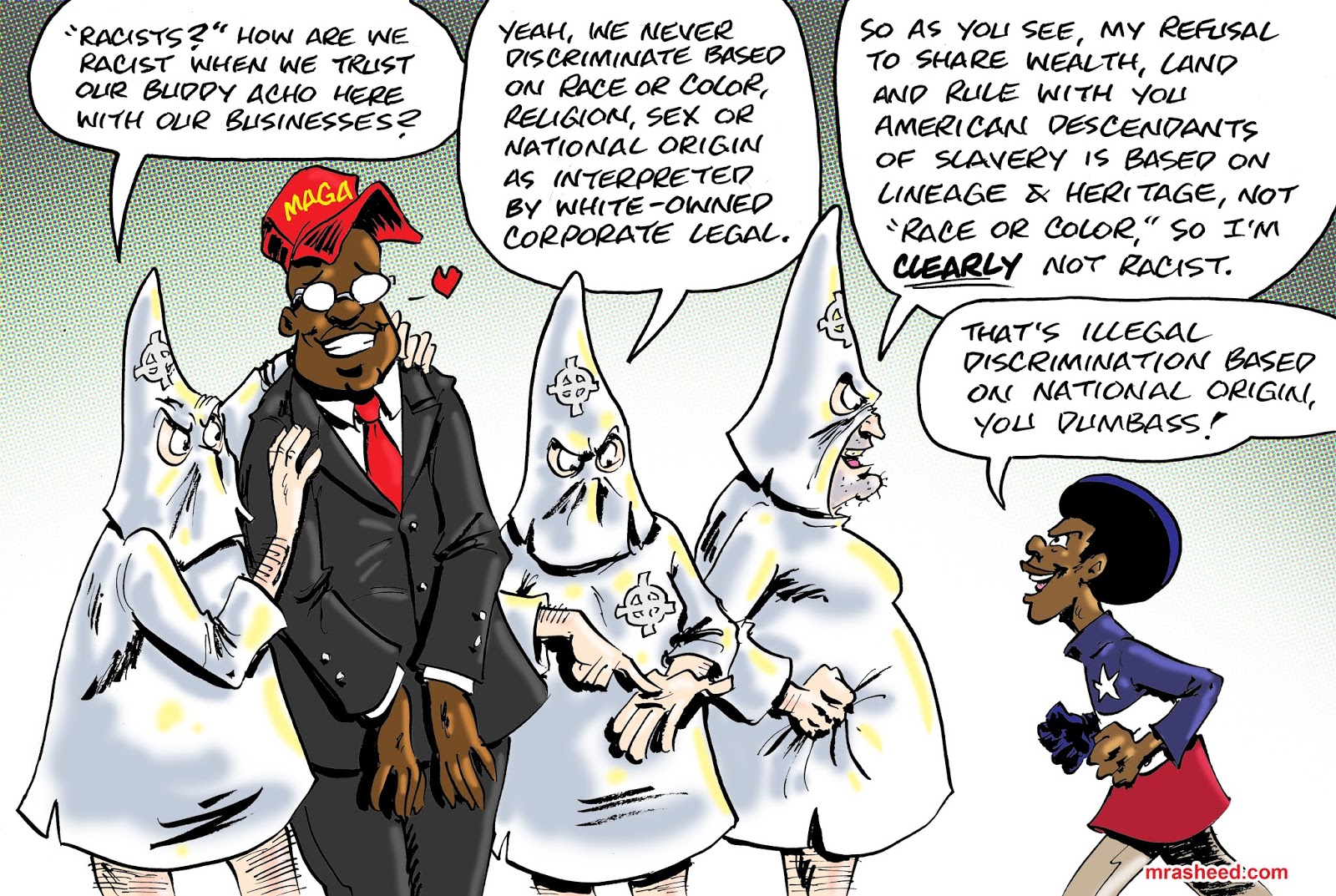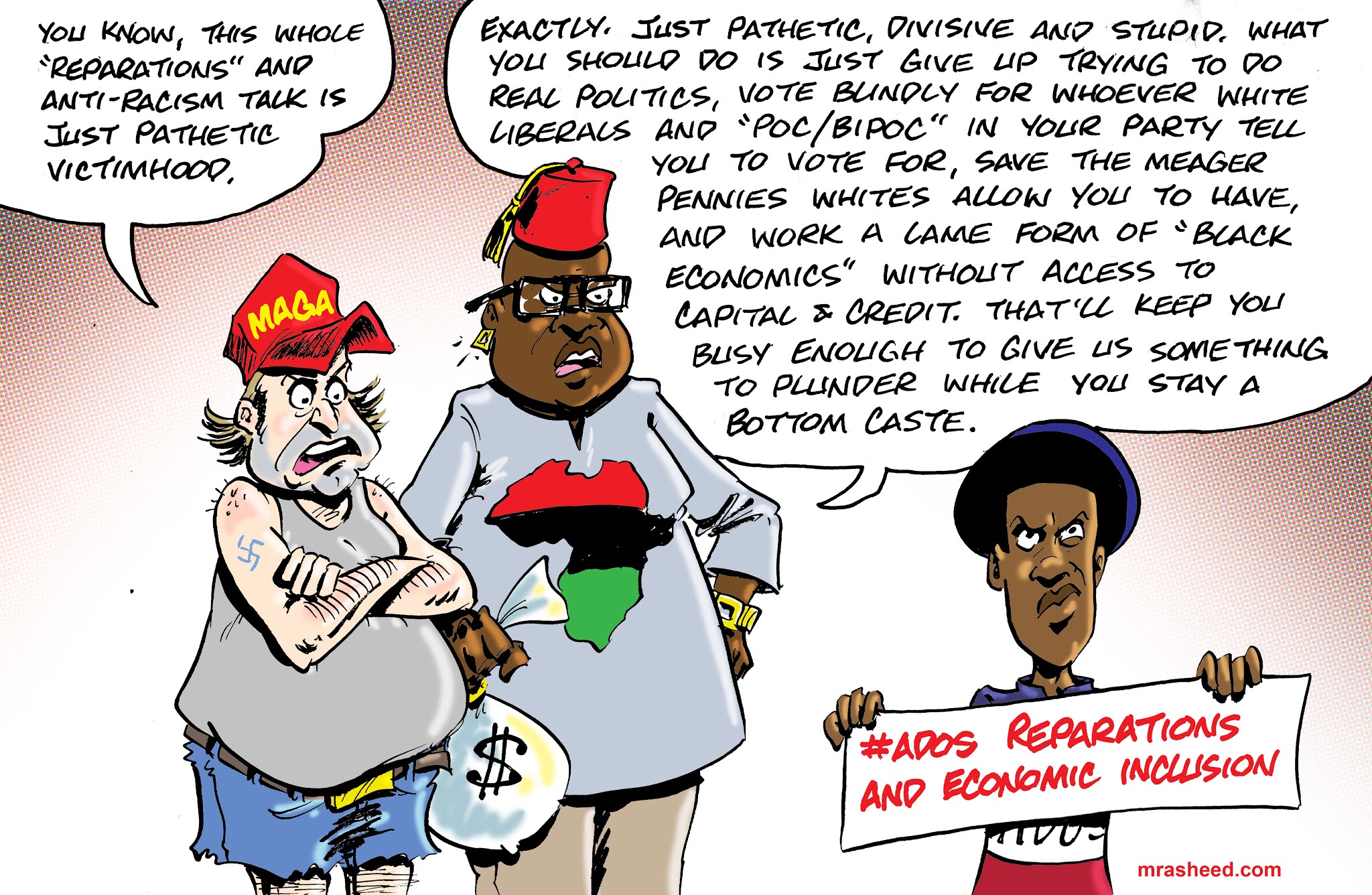 Rasheed, Muhammad. "The 'Post-Racial' Psychological Warfare Tactic." Cartoon. The Official Website of Cartoonist M. Rasheed 17 Sep 2020. Pen & ink w/Adobe Photoshop color.