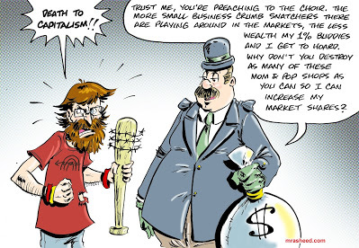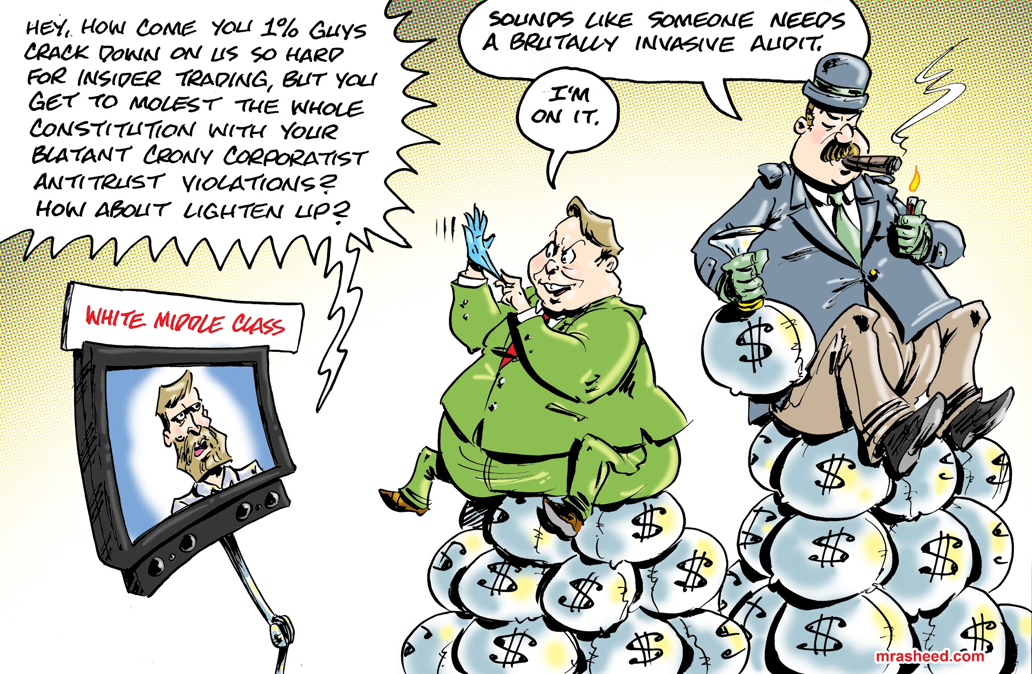 Rasheed, Muhammad. "Holes in the Corporate Flimflam." Cartoon. The Official Website of Cartoonist M. Rasheed 06 Sep 2020. Pen & ink w/Adobe Photoshop color.