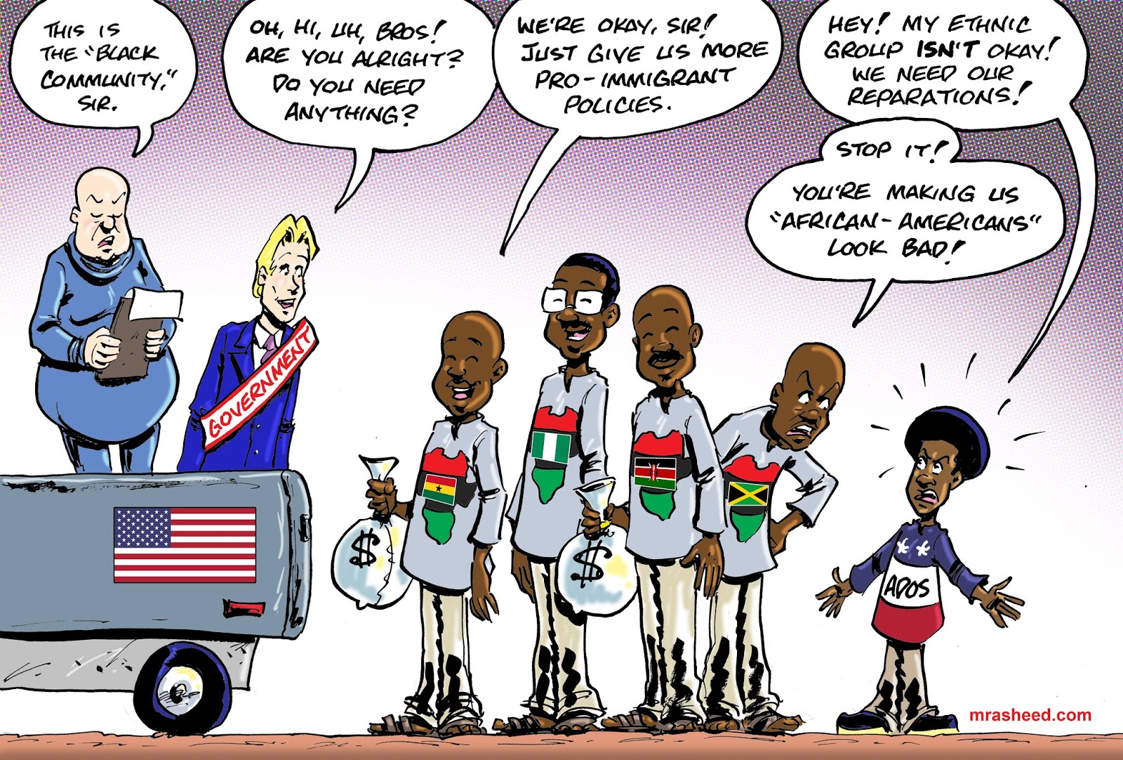 Rasheed, Muhammad. "The 'Flat Blackness' Smothering Effect." Cartoon. The Official Website of Cartoonist M. Rasheed 26 Aug 2020. Pen & ink w/Adobe Photoshop color.