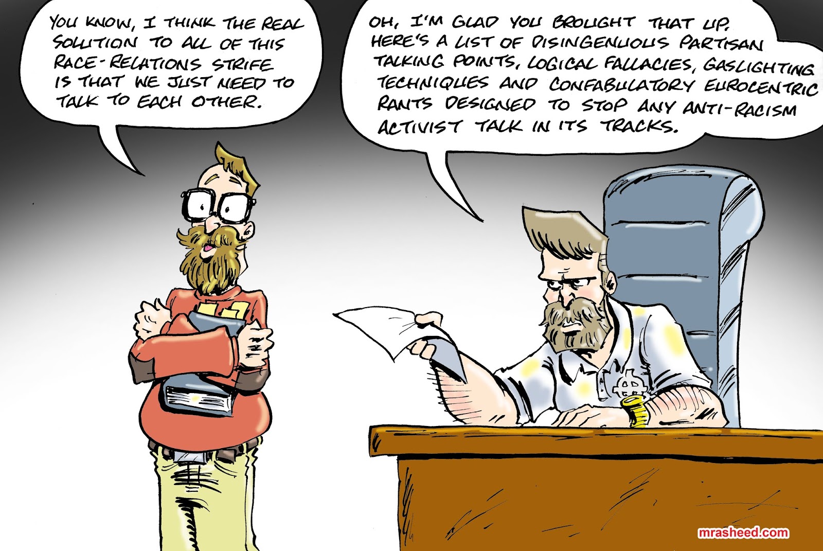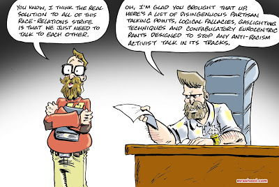 Rasheed, Muhammad. "Faux-Solutions of Weaponized Discussion." Cartoon. The Official Website of Cartoonist M. Rasheed 17 Jun 2020. Pen & ink w/Adobe Photoshop color.