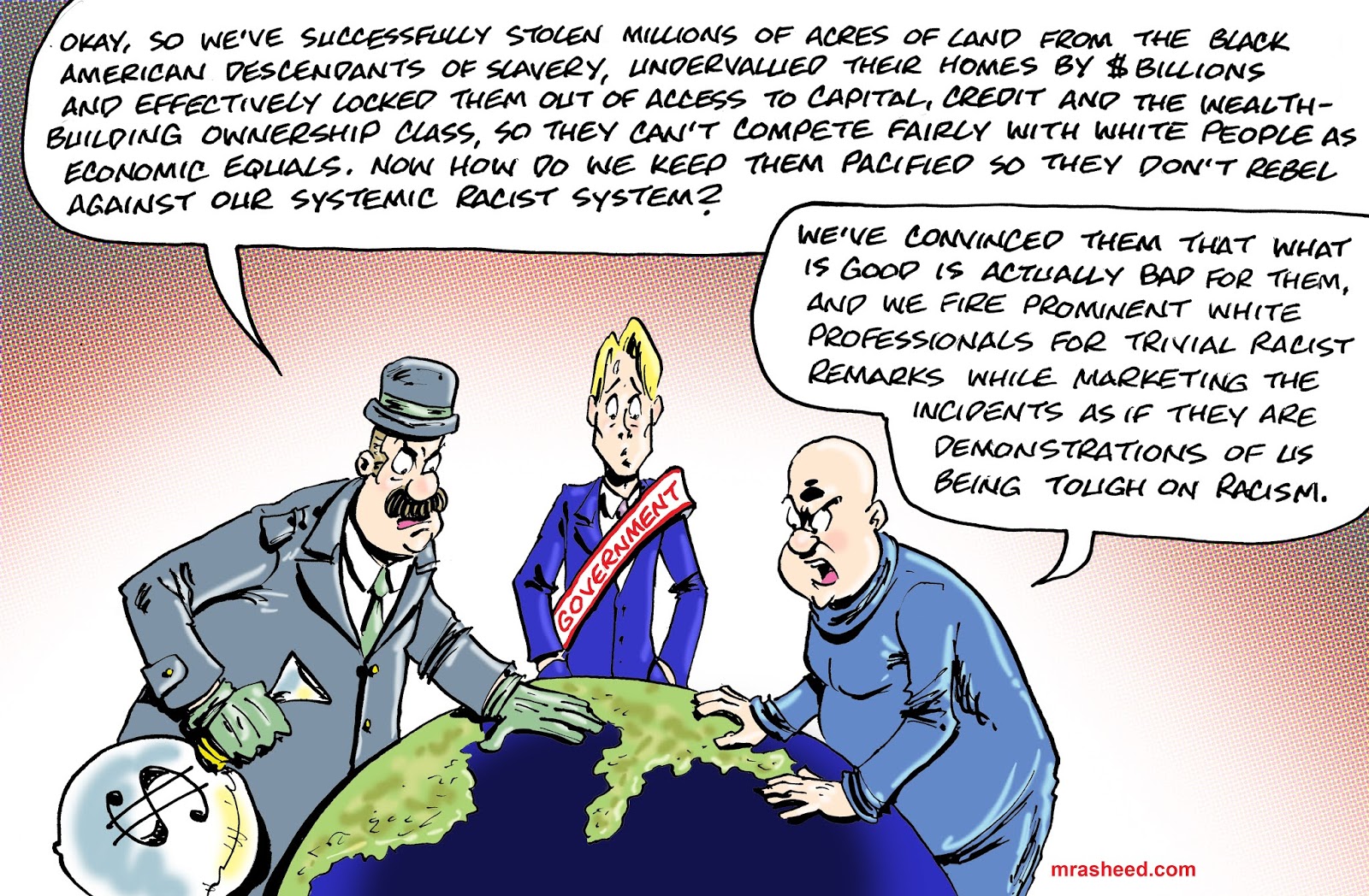 Rasheed, Muhammad. "Sacrificing the One White for the Self-Interests of the Richest Whites." Cartoon. The Official Website of Cartoonist M. Rasheed 17 Jun 2020. Pen & ink w/Adobe Photoshop color.
