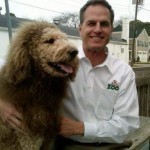 • The dog is a Labradoodle. His name: Charles the Monarch. He has his own FaceBook page.