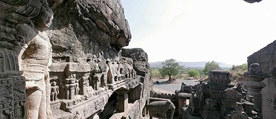Panoramic View of Ancient Indian Caves Carved Into Cliff