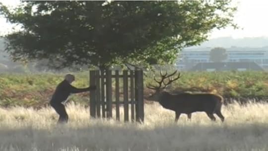 A testosterone-fuelled stag chases a man up a tree in Bushy Park, west London. A woman who filmed the incident, Lisa Acremom, describes what happened: two stags were facing up to each other when a passerby got too close, and one of the stags turned on him. The stag chased the man until he climbed a tree to safety