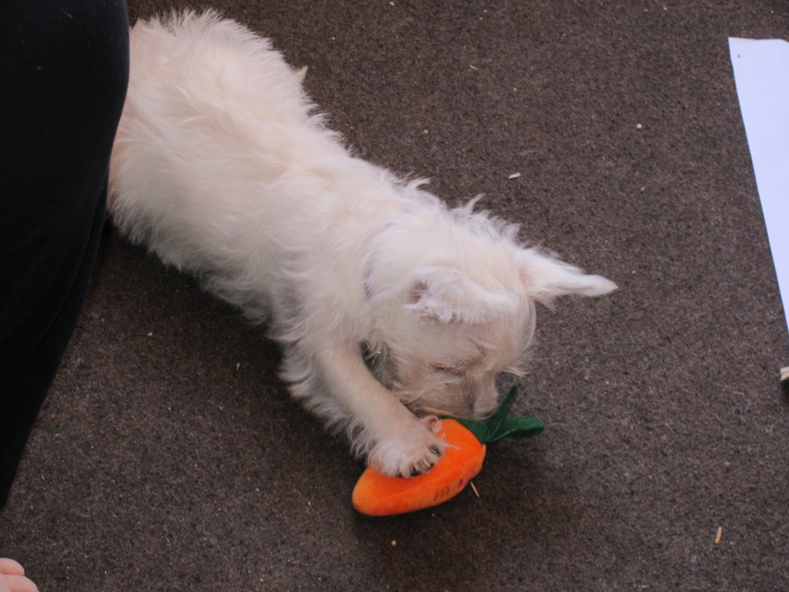 And - speaking of playing - here I am playing with a cuddly squeaky carrot toy the humans got me: