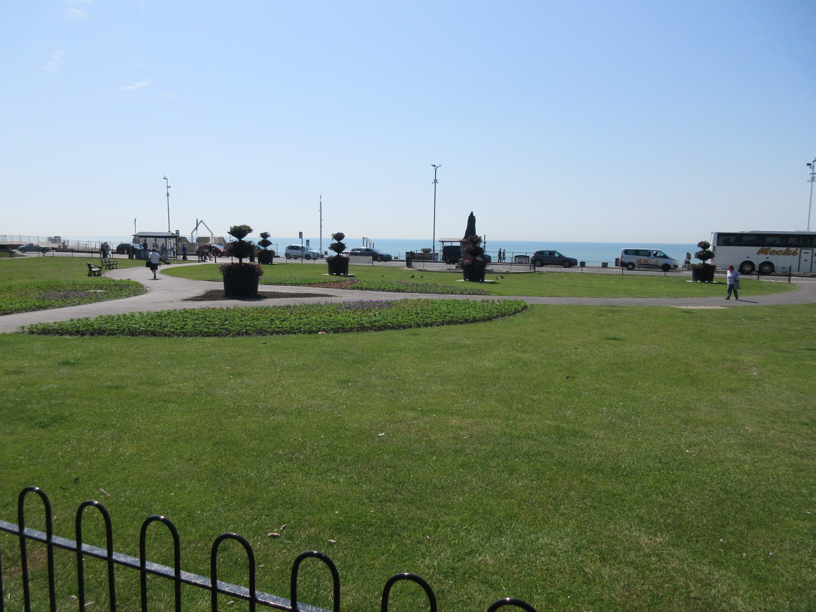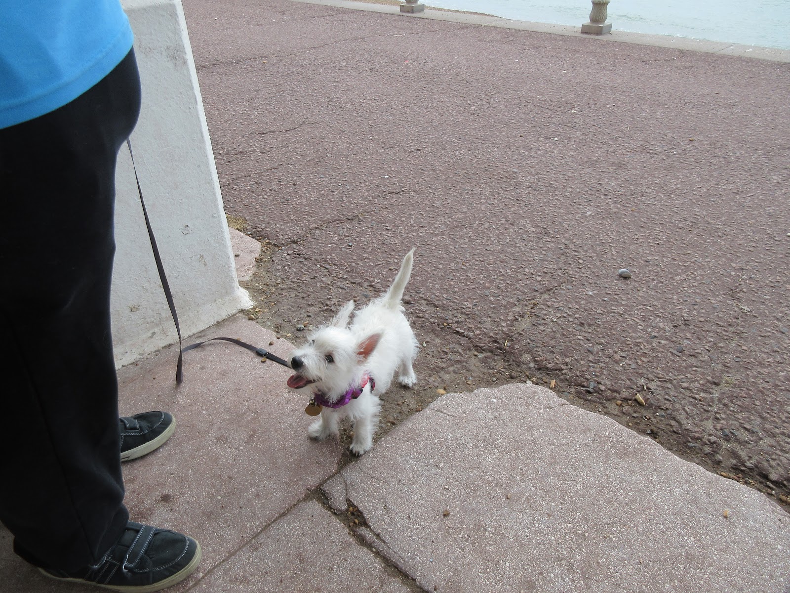 And here's a photo taken when we were hanging out near the beach one day. The humans had let me have what they call my "extending lead" on. It's purple like my normal lead, but lets me run around a bit more freely, even if the humans are being lazy and sitting down. I like being on that when we're out for walkies; I hate how the other one stops me going places when I want to check out an interesting smell or something. Anyway, here's the photo:
