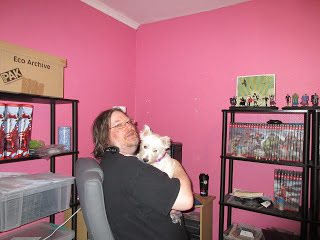 Finally, here are a couple of photos of me having some cuddle time with the Daddy human. He was trying to use his computer, but I didn't care. I love my Daddy, and wanted cuddle time with him. So, here are the photos: