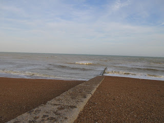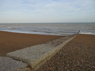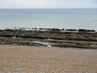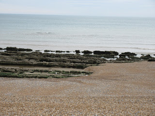 (Both above photos show a shingled beach with a rocky outcrop - looking something like a low rock wall - leading down to the ocean).