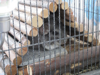 To help me and my chinchilla sister, Maizie, deal with the hot weather, the human caretakers got us a special slab that gives us something cool to lay on. They put it under the arch of our log house, since that's our favourite place to be. Here are a couple of photos of us on it. The first one is me, the second is Maizie. You can see the slab under me the best.