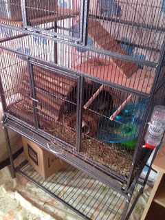 Since the photos for this post were taken, however, we've removed the ladder - or ramp, if you prefer - between the second and third levels. Well, actually, Maizie removed it, and we decided not to bother with putting it back any more. Apparently Maizie felt it was in the way of where she wanted to stretch out on the second level, so she kept shoving at it until the hooks holding it came loose (no matter how well we anchored it) and, after putting it back a few times, and realizing Maizie was most likely going to keep doing it... In fact, she seemed to figure it out quicker each time... We decided it would be better to have them need to jump between levels, than to risk Maizie doing that when Mollie is in the way of the falling ladder. Besides, chinchillas are good climbers and jumpers, so it's a really easy jump for them. We had a similar issue with ladders with the degus, and never even bothered to attempt putting ladders in the degu cage when they moved in to the cage they currently have (which they've now been in for close to two years).