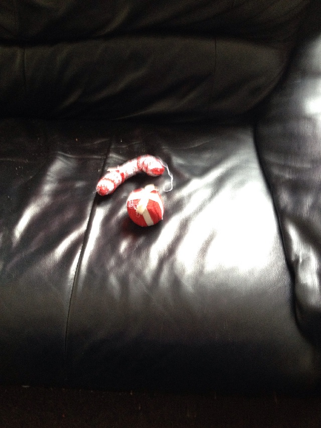 I actually made two sets of the bauble, candy cane, gift, and stocking. But I only got photos of one set. The other set is as identical as it's possible for handmade items to be. At least, in everything but size; the other set's slightly smaller. I don't have the other set any more though, since I gave them to my Mam. But this set I'm keeping for myself.