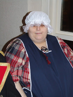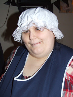 I should have had a white apron, but I couldn't find a big enough one that I could get to me in time, so I had to make do with the blue one (my choice was blue, green, or red; I'm not 100% certain, but I would think blue would have been a more likely alternative to white than red or green in the 1800s, and Kelly, my Mam, and my Grandma all agreed with me when I asked their opinions). I also should have had a bit more of a girly outfit, if you know what I mean. But, again, I had to work with what I could find, and at least I wasn't in joggers (sweats) and a t-shirt, which is what I usually wear. ;)