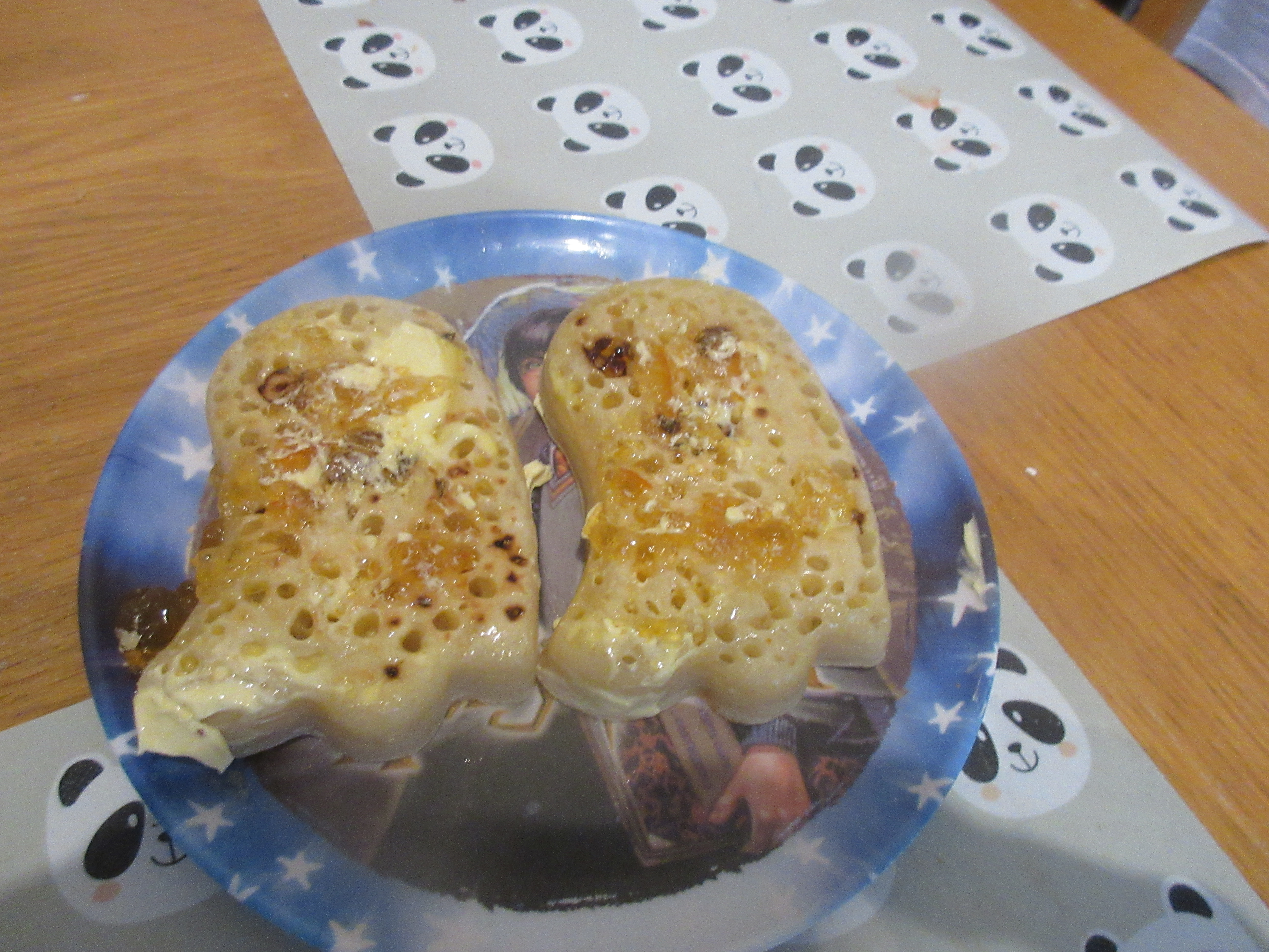 I brought a packet of ghost crumpets when I did my grocery order. There were six in a packet, so I had two for breakfast each morning on Saturday, Sunday, and Monday, with some vegan butter and orange marmalade on them. Here's a picture of two of them on my Harry Potter plate: