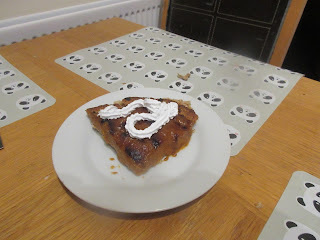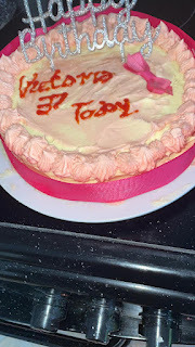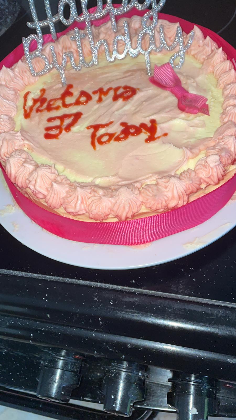 Mam made me a vegan birthday cake from scratch. It was a vanilla sponge with lemon butter icing. It also has pinkish butter icing writing on it that says, "Victoria, 37 today," and a "Happy birthday" cake decoration. Plus she put a pink ribbon around it. Here's a photo: