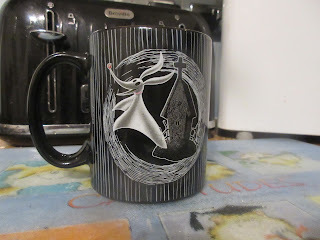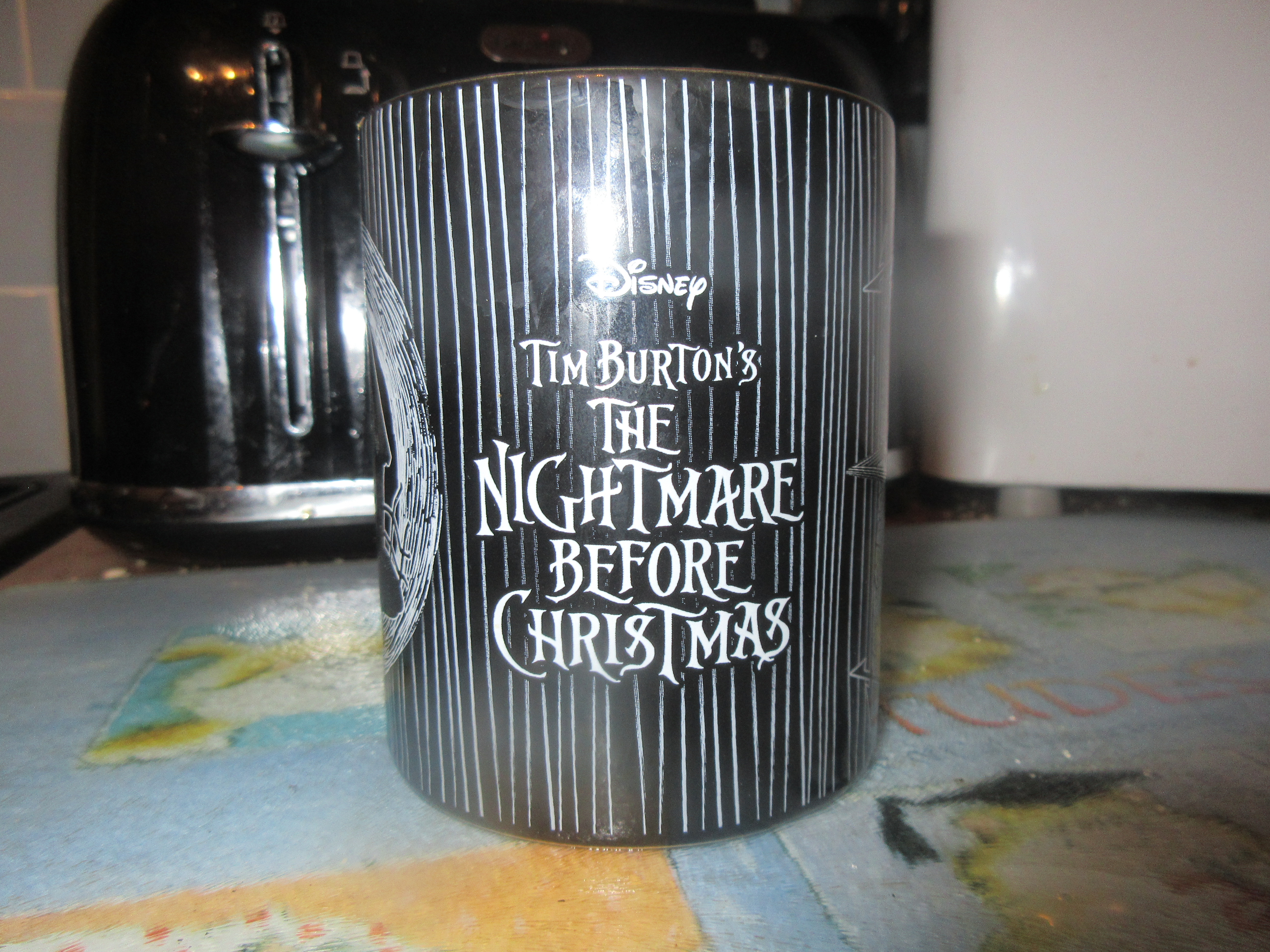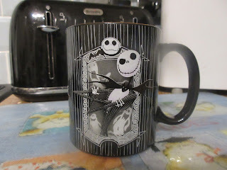 Sunday afternoon and early evening I watched Halloween movies while enjoying some of the goodies I baked, and several cups of the pumpkin pie spice tea I had in my tea subscription box. I had the tea in my new "Nightmare Before Christmas" mug, which Kelly told me to buy myself when I observed recently that I didn't have a Halloween mug for the seasonal teas to be served in (which I only commented on because it mentions using your favourite Halloween mug in the brewing suggestions for the tea). Here are photos of the mug, taken at different angles so you can see the images on it fully:
