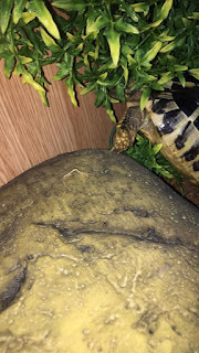Artemis is way easier to get photos of. Mollie is not a fan of the flashy thing. Plus, it's much easier for someone without sight like me to keep track of Artemis' movements than Mollie's, since tortoises move much slower than chinchillas (though tortoises actually do move faster than you might expect).