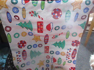 I've been making some holiday themed fabric bags as reusable alternatives to wrapping paper for gift giving this year. Here's one of them so you can see what they look like: