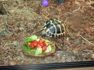 We always give the petkids something for their birthdays, but there's not much to buy a tortoise as a gift, so I treated her to some extra helpings of fruit. My Mam even got in on it and contributed some melon. So, Artemis got a special hatchday breakfast of lettuce, tortoise pellets, melon, apple, raspberry, and strawberry. Here's a photo and video of her, taken right after we presented her with her breakfast: