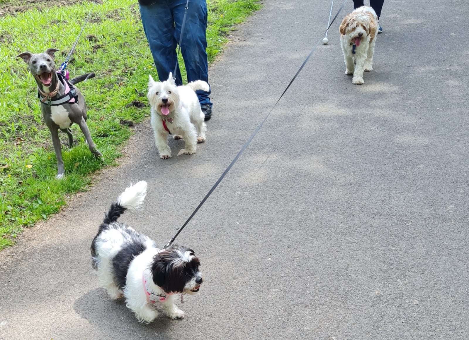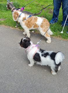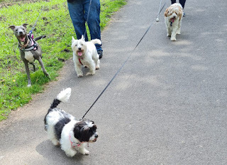 Since Nana can't do big walkies without her special sticks or wheels these days - and, unlike Mummy, she needs two paws for her sticks (Mummy says they're called crutches) so doesn't always have a free paw like Mummy does with her special seeing stick - Nana got to be in charge of the camera while Mummy and Uncle Wayne held our leads. We were on trace leads, because it gave us some freedom to run, but meant Mummy and Uncle Wayne could keep better track of us. They seemed to think we might take advantage of there being four of us to keep track of and run off otherwise, and didn't believe us when we said we were cute innocent little puppies who would never do a thing like that. Can't think why.
