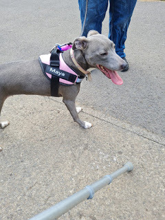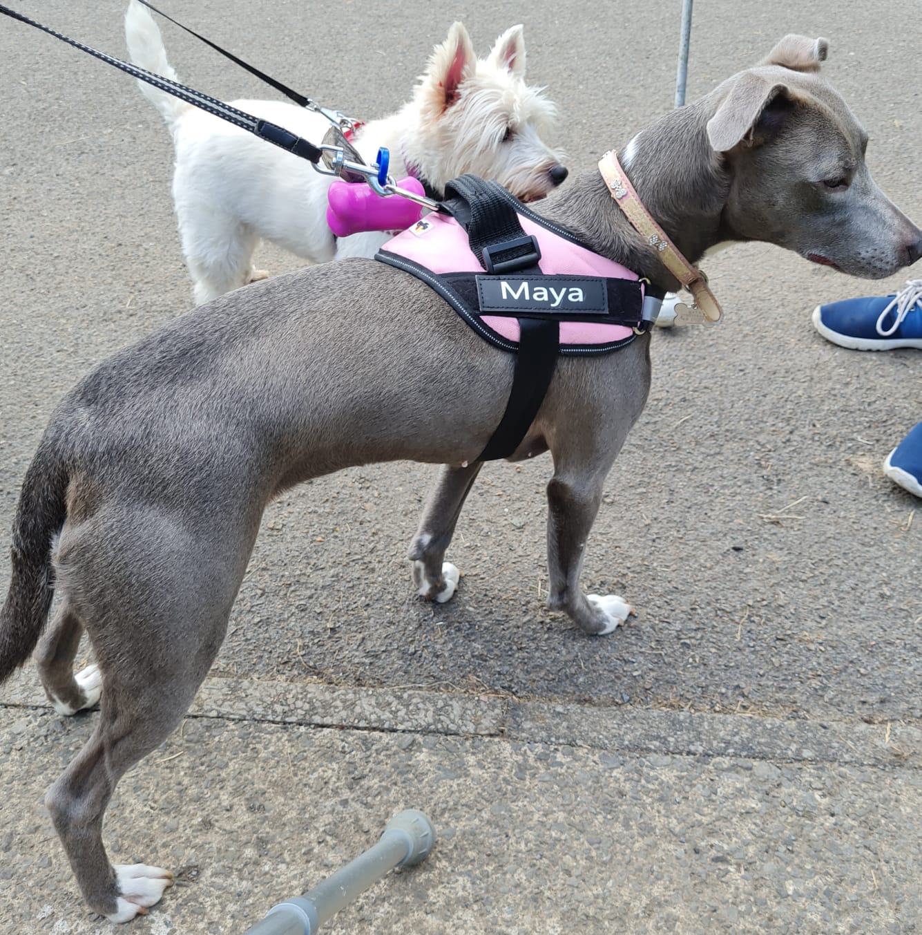 Uncle Wayne lives somewhere Mummy says is close enough to the park to walk to it, so he met us there with his Wippet x Staffie, Maya, and we all got to go walkies together, which was great fun.