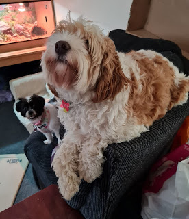 Mam took this photo of Logan with Izabel a little behind him when she came over the other day. Logan was up on the back of the corner piece from a corner sofa we're currently using as an armchair, and Izabel climbed up to get a closer look at what he was doing up there. With how tiny Izi is, especially compared to Logan (who's a big boy for his breed, having reached the maximum size a Cavapoo can reach, while Izabel is at the opposite end of the size scale) Mam says it should be titled, "Little and large."