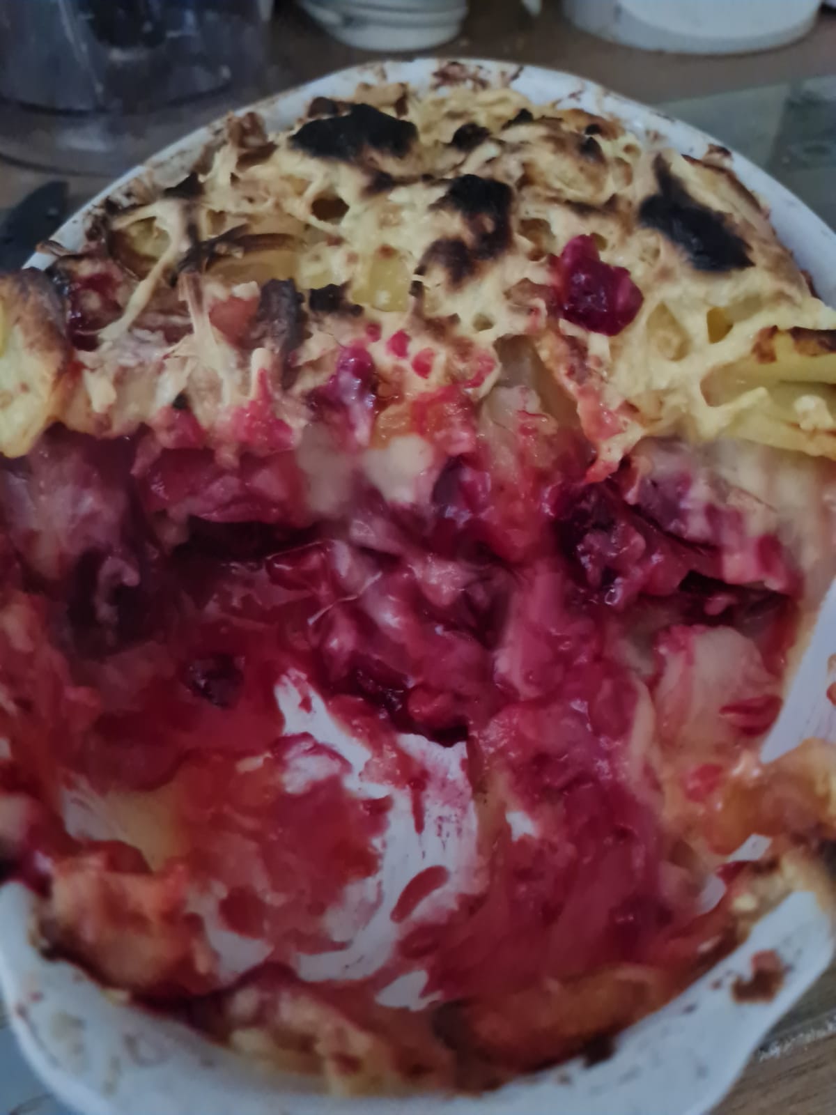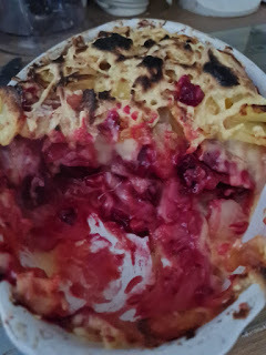 It was a chicken dinner for the rest of them, but we made me a vegan potato and beetroot gratin, which Mam had spotted the recipe for when looking for something for me to have with my potatoes, parsnips, carrots, broccoli, and cauliflower. I wouldn't have minded not having anything else with all that veg, but she insisted, and the potato and beetroot gratin did sound nice, so we made it. It was beetroot, and potatoes, sliced, and then layered with some vegan cheese, with a white sauce (flour, vegan butter, and vegan milk... Oat in this case, since it's what I had open). It was very nice too. Here's what it looked like after it was cooked, both before and after we started serving some of it: