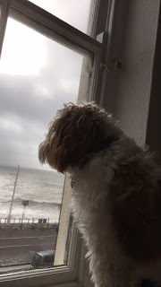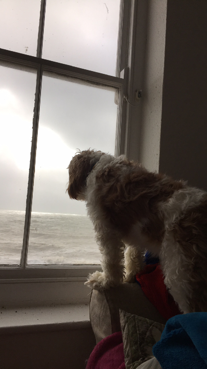 The above photo shows the view of the ocean that can be seen from our building, and was taken on November 1st 2020. Logan was admiring the view (and barking at things going by) while I was taking the photo, so I got a couple of photos of him at the same time. Here they are: