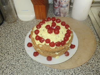 It's a two layer cake with butter cream icing between the layers, more butter cream icing on top, and cherries to decorate it. All 100% vegan, of course. Here's a photo: