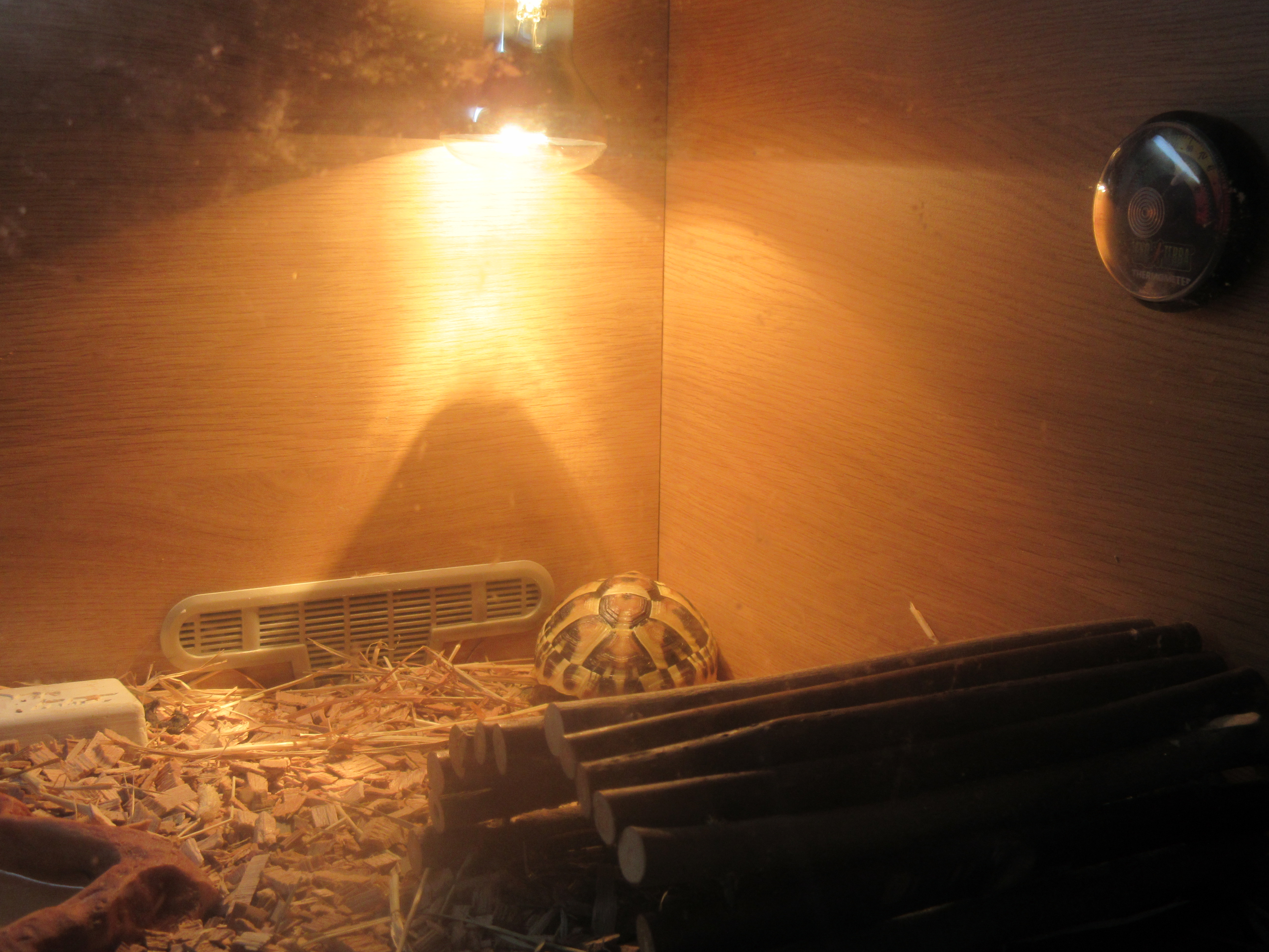 Those three photos are just random ones of me trying to warm up below the heat lamp one morning a couple of weeks ago. They were trying to get a shot of a thing I do where I stretch my front end up towards the lamp, but I wouldn't do it when they pointed the flashy thing at me, so they just got me in the corner there hanging out under the lamp. But I figured you might want to see them anyhow, so there you go.