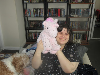 Kelly got me a glittery pink unicorn cuddly toy as a getwell present when I was in hospital. Here I am holding it: