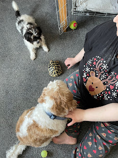 Still being beyond exhausted from about two weeks of dealing with both Mam’sdogs on top of our own, I knew there was no way I could deal with both of themcoming here again. But Izi is a relativelycalm dog as a rule, so we agreed - with some reluctance, I admit, due to my level of exhaustion - to take her back if someone else would haveCai. I mean, I feel bad for Izi and Caihaving to be separated from each other on top of being pulled away from Mam andtheir home again, but Cai is a very energetic pup, who becomes very easily overexcited, and having him here againwhen I’m already so drained from the last time would not have been a good plan. So Izi came back to stay with us Sundayevening, while Cai went to stay with someone else. At the time of writing this, Mam is still in hospital, and Izi is still here.