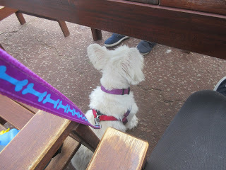 Lilie, on the other hand, was perfectly happy being outside, watching - and sometimes trying to play with - the other people out there besides our humans. See how she's just sat beside Daddy's feet while he's sat at the table?