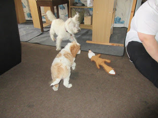 Anyway, happy to help us not miss out on any of his milestones, Tessa was kind enough to send photos of Logan's first day at playschool, so here he is, making friends on his first day at puppy playschool: