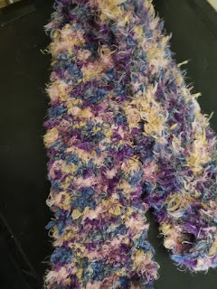 I’d made this scarf with a stitch pattern we did in loom knitting earlier in the month, and I thought my Mam would like it, so I planned to give it to her. I literally only just finished it in time because of putting almost everything on hold to focus on the de-cluttering and organizing. When I say, “literally” I mean it. I was just weaving in the ends when she called to say she was on her way over. Anyway, I don’t know how well you can see the ripple pattern in it because of the kind of wool I used, but here’s a photo of the finished scarf, which I had her take for me before she left with it, because I wanted to be able to post a photo to share with you. LOL!