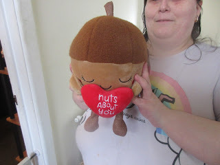 And here’s a photo of me holding the cuddly toy Kelly got me from the petkids. It’s a cuddly nut that’s holding a heart that says, “nuts about you,” on it. He thought it was cute, and I agree. Anyway, here’s the photo: