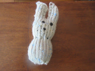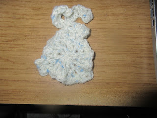 It’s meant to be a wooly representation of the marshmallow “Peeps”you can get around Easter. At least,people in the US can get them. Apparently they come in rabbit and chick shapes. Well, mine is a rabbit shape, and made with arandom white yarn with blue flecks in it I had in my stash, since that’s what Igrabbed (probably because it was near the top from doing the crochet rabbit appliquéI made a few weeks ago).