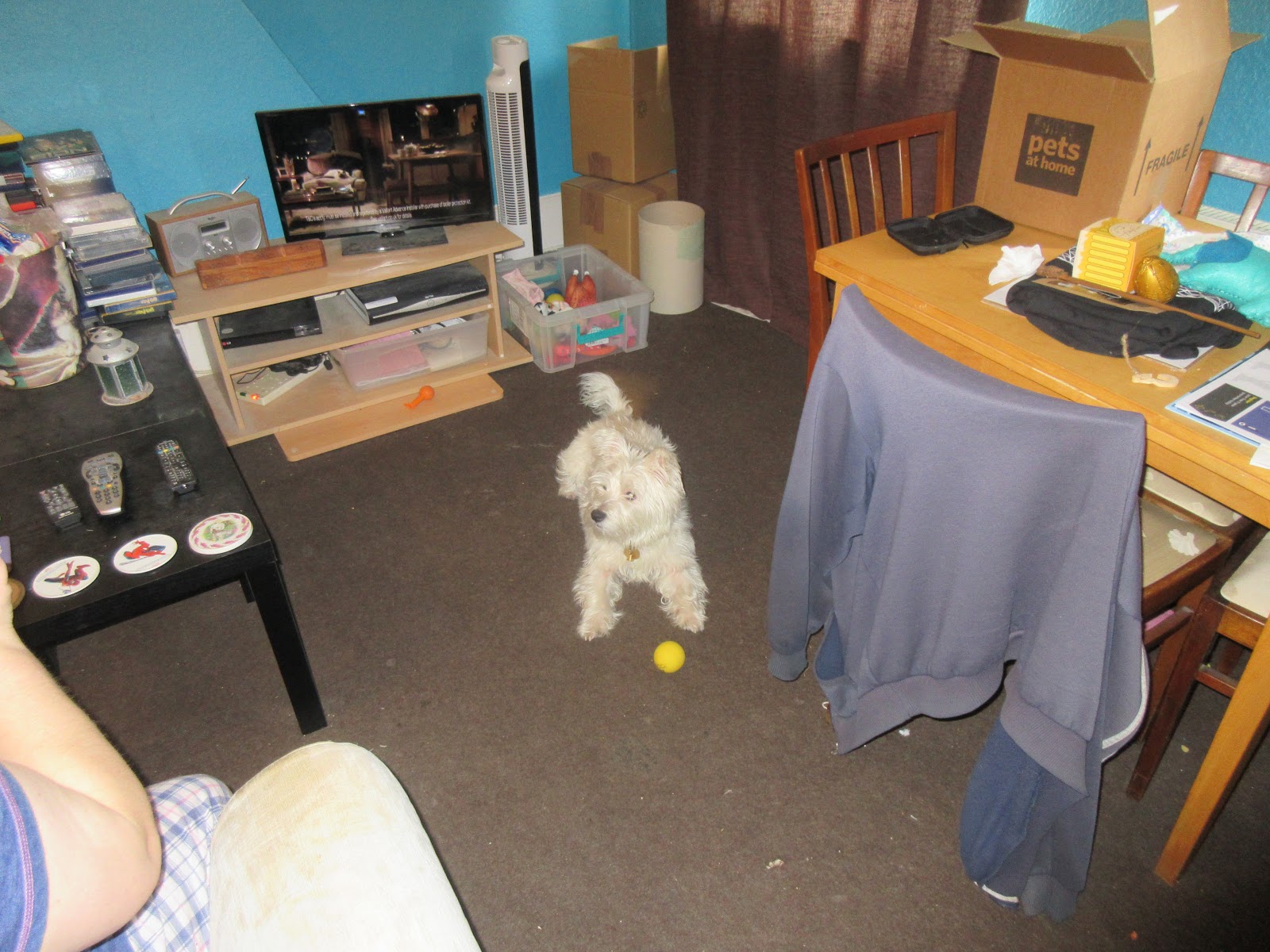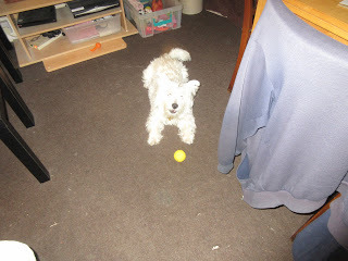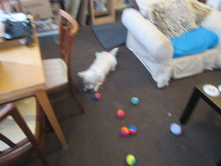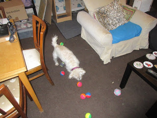 Anyway, Daddy just tipped the box of balls out on to the floor for me. It was so exciting! I didn't know which ball to play with first! I ended up playing with them all a bit, and eventually picked one to play fetch with Mummy with. Although, I changed my mind after a bit, and we played fetch with more than one ball. Well, I had to try them out, didn't I?