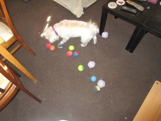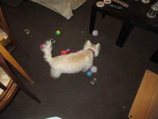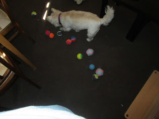 If that wasn't enough fun to pack in to one month, I also had one of those birthday things a couple of days ago (on Tuesday, which was March 26th). I knew I had one coming up, because Mummy said I was only getting the ball a little early. Anyway, guess what I got for my birthday? More balls! You can never have too many balls, after all. Apparently Mummy and Daddy agree, since they got me a selection of different balls for my birthday. I got rubber balls, tennis balls, and even squeaky balls. I love balls! Here's a few photos of me with most of my new balls: